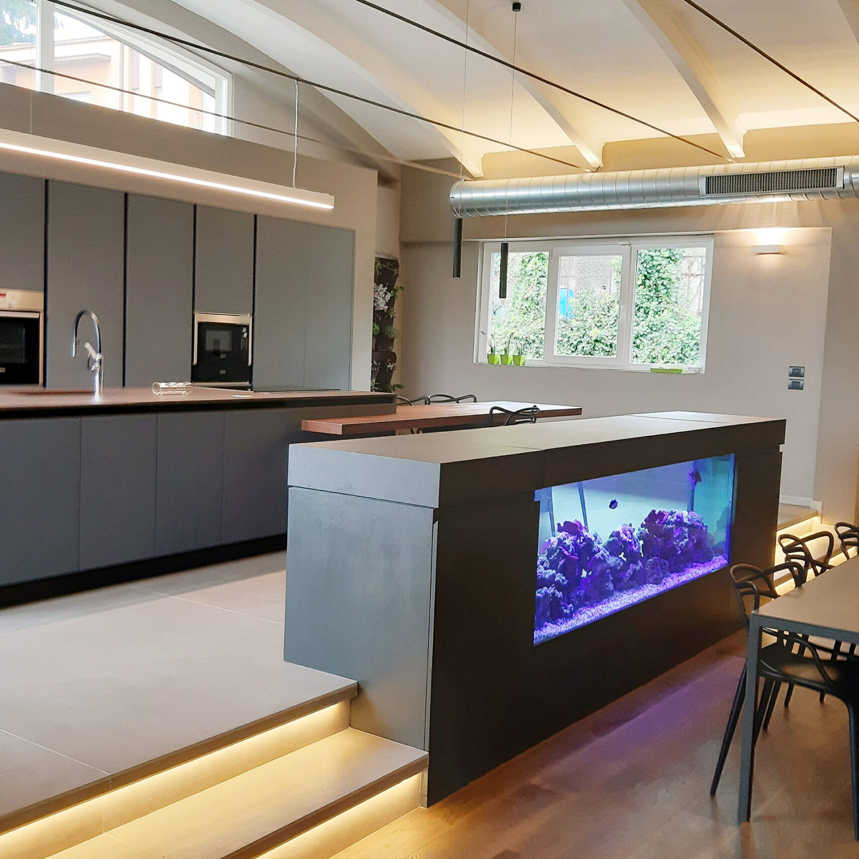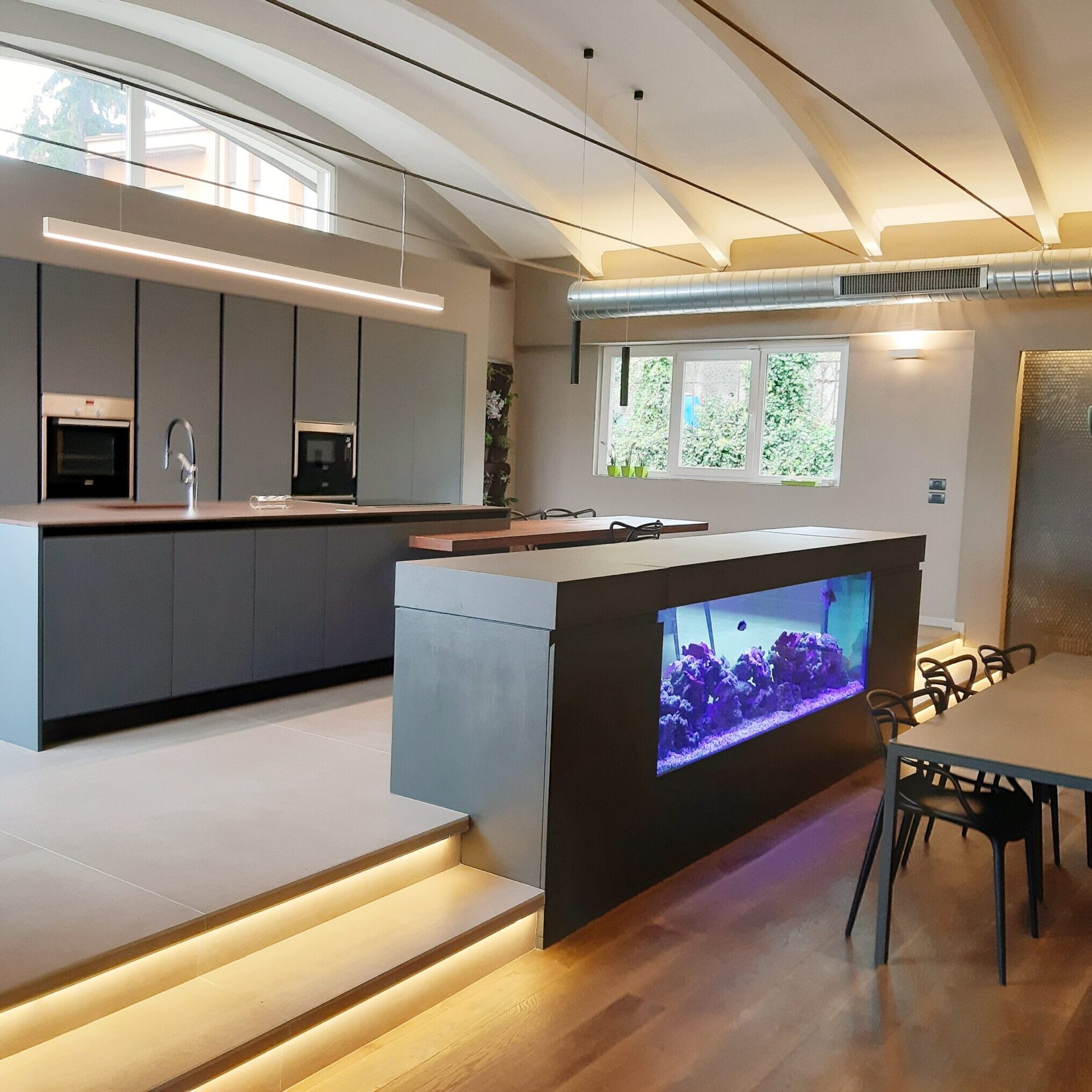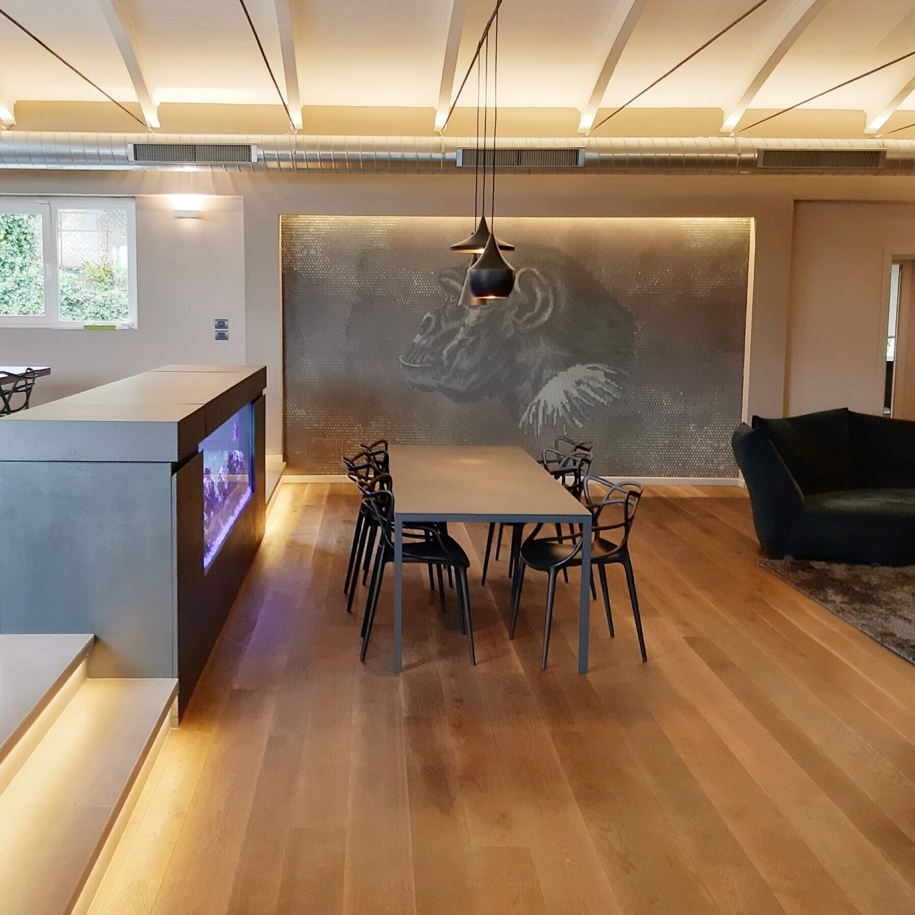 Un intervento realizzato a quattro mani tra interior e committente. Ci siamo lasciati coinvolgere dal genius loci e dal mood jungle style alla ricerca del comfort e dell’equilibrio. Ci sono voluti pochi mesi ed un cliente disponibile ad abbracciare scelte non convenzionali e stereotipate per realizzare questa abitazione che si sviluppa su di un unico livello e che ha ospitato in passato un magazzino di fiori. Le istruzioni erano precise: una casa che accogliesse una area wellness, la presenza di un grande acquario che ospitasse pesci tropicali e molto verde in memoria del sapore del luogo nel passato.