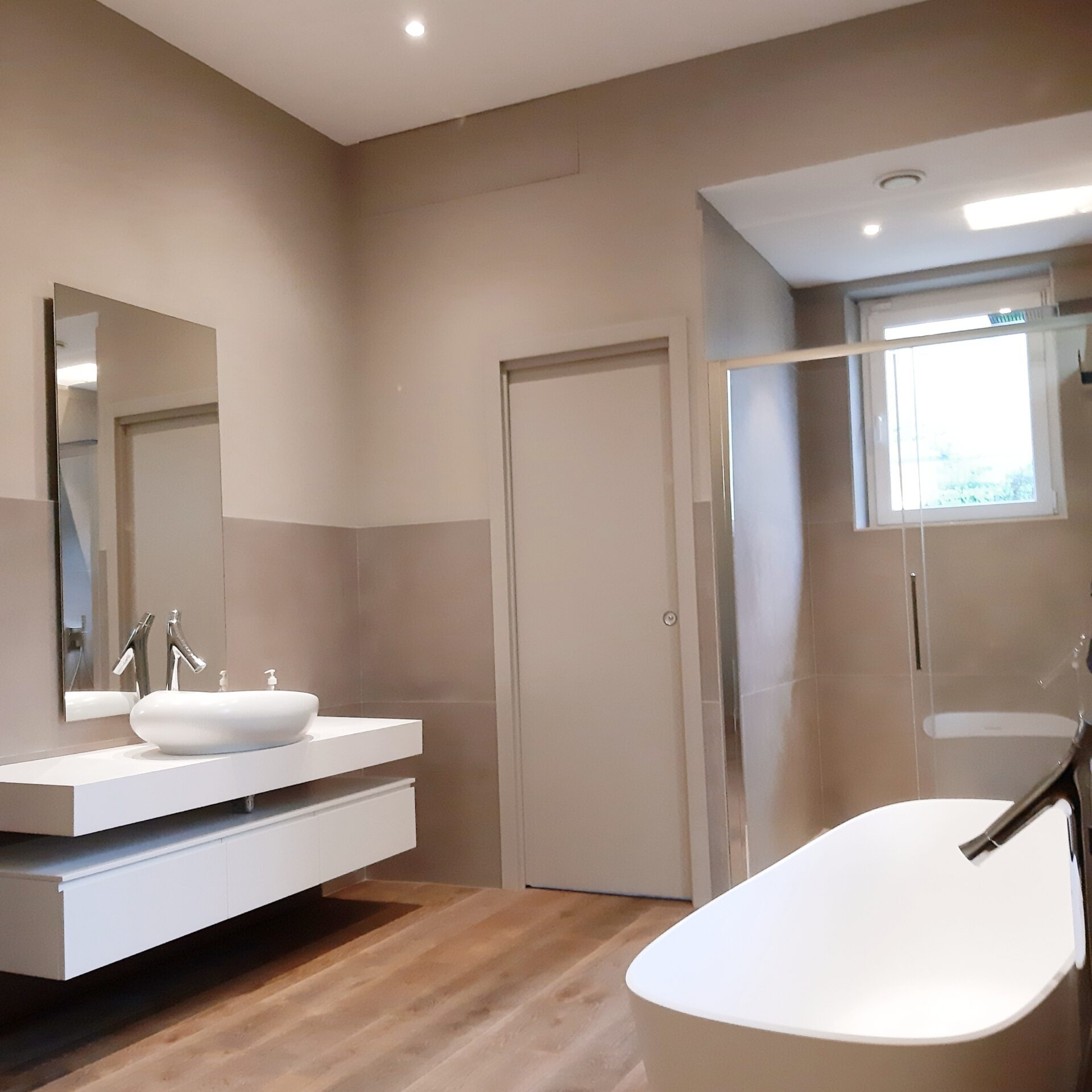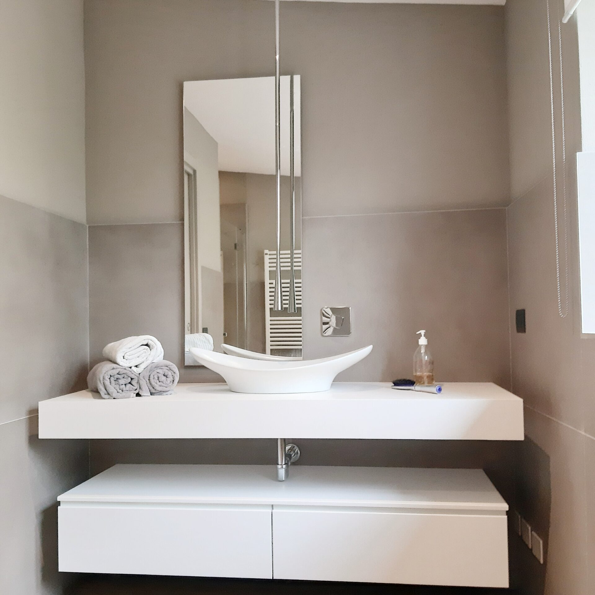 Ho prestato molta attenzione affinchè l’ambiente emanasse una energia di sobrietà lavorando con toni che virano dal verde militare, al verde piombo al verde oliva con dettagli nero antracite e grigio tortora.