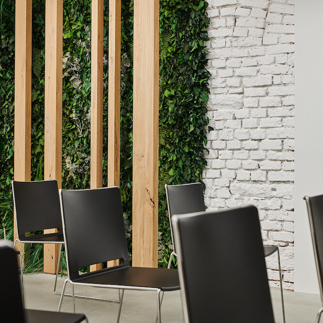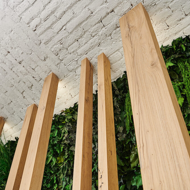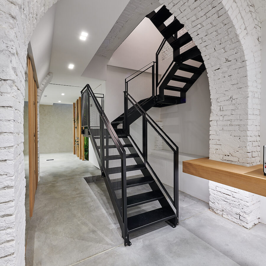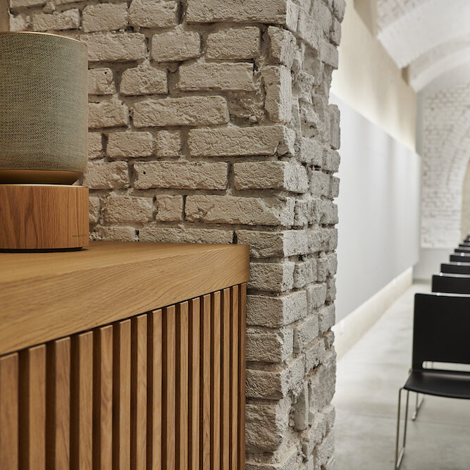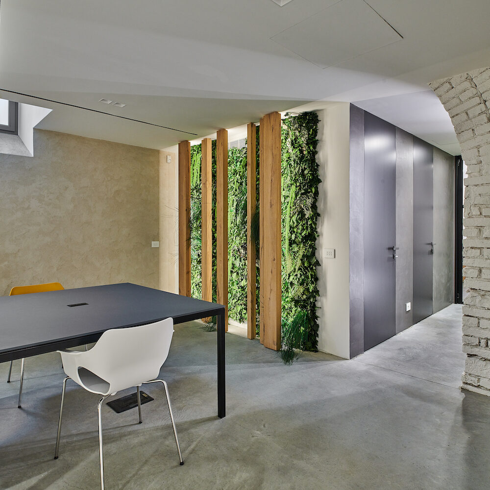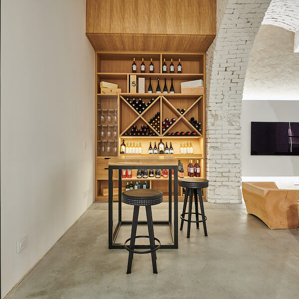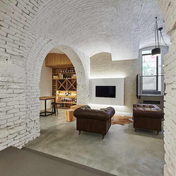 Filo conduttore gli elementi ad arco con i brick a vista ridipinti di bianco, declinati nelle volte e nei passaggi e interrotti da pareti luminose, texture di intonaco materico, accenti di verde verticale e vetrate in ferro che delimitano gli spazi di condivisione tra la kitchen area e la zona living dove è stato pensato anche l’angolo degustazione con wine-library.