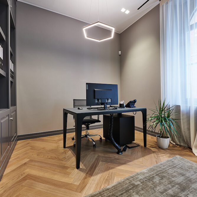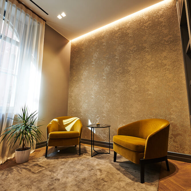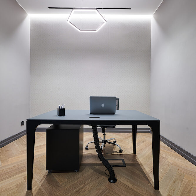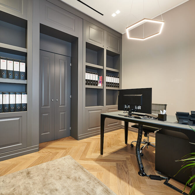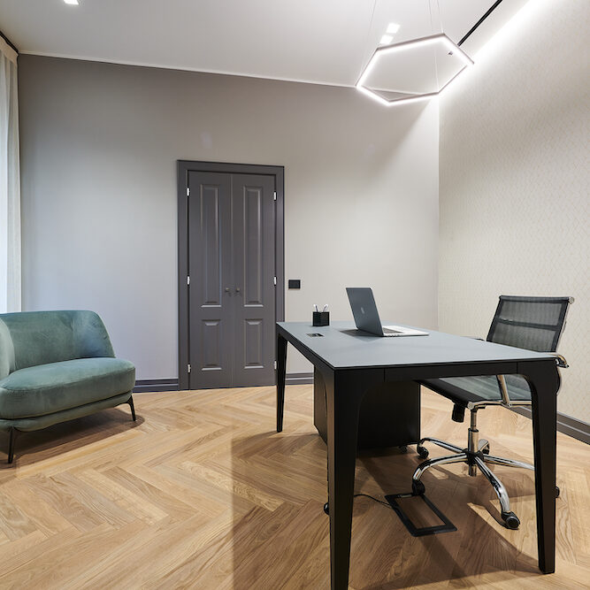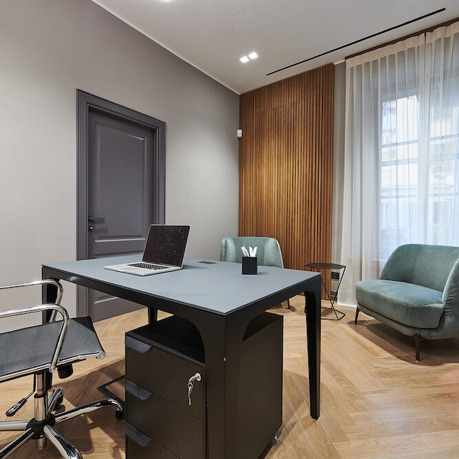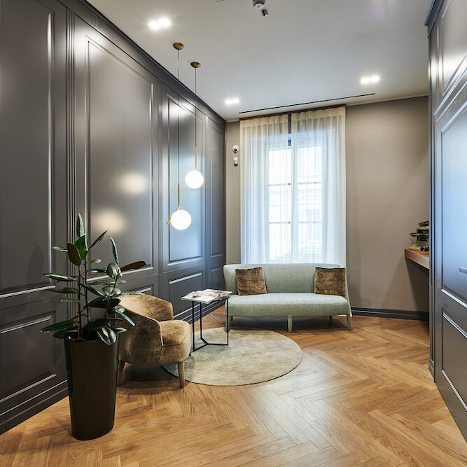 Oggi, nei nuovi interni, l’allestimento riunisce al piano nobile gli uffici direzionali realizzati con l’utilizzo di boiserie classiche a cornice che convivono con quelle moderne a listelli, scrigni che svelano zone funzionali, tessili preziosi, carte da parati in damasco, arredi contemporanei di memoria e un pavimento che reinterpreta in chiave moderna la posa a spina pesce.
