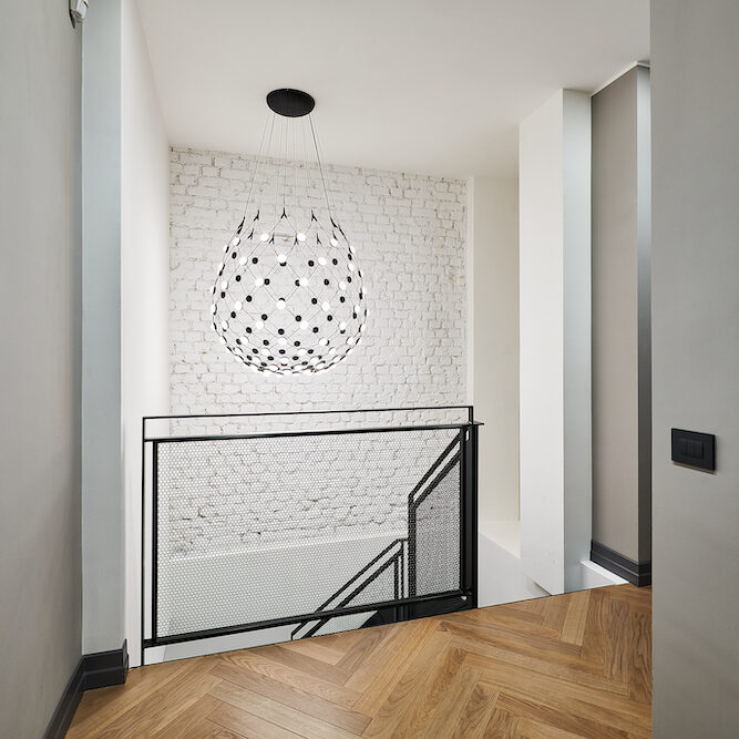 Dal salottino di ingresso, il passo del visitatore è catturato dall’elemento attrattivo dello chandelier gioiello che, installato sul vano scale, invita a scoprire l’atmosfera dal fascino autentico del piano undergroud