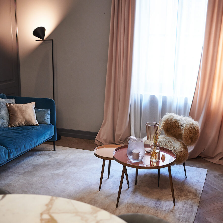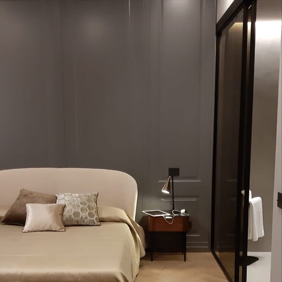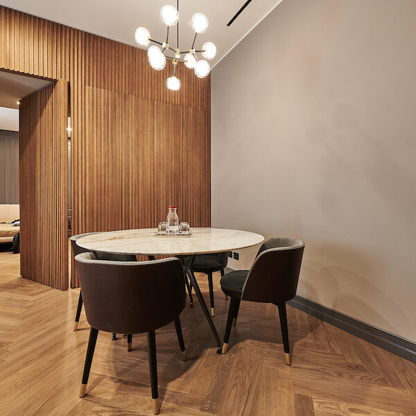 Le suite è nata come esigenza per accogliere ospiti o dirigenti della società di Rossetto di Padova, per cui è stata realizzata la sede a Milano. L’ambiente evoca uno spazio elegante e raffinato ma non pretenzioso, grazie al sapiente studio cromatico tra texture vibranti, tessuti e materiali.