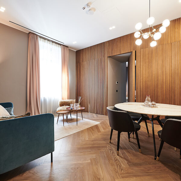 Dalla scelta dei materiali alla manodopera di eccellenza, il progetto è curato in ogni dettaglio. La suite è un luogo di forte personalità e carattere, realizzata attraverso un linguaggio di forme pure e colori sobri che rimandano ad una eleganza di altri tempi.
